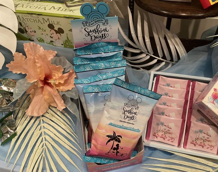 そして3つ目は、中身の味もさることながら、ついついパケ買いしたくなる「ビスケット」1500円。夏らしいデザインの小袋に、ココナッツ味のひとくちサイズのビスケットが入っています。全部で8袋入りで、バラマキにも◎。箱は折りたたんでディスプレイにもできるので、オフィスみやげにおすすめしたいお菓子です。