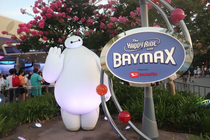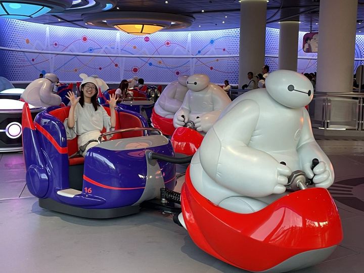 まずは「ベイマックスのハッピーライド」。今年の夏は既存の6曲に加え、Mrs. GREEN APPLEのコラボ楽曲がランダムに流れるスペシャルバージョンで運営中! 夕方早めに乗ってしまったのでライトアップ感は薄いのですが、夜はもっとカラフルでキレイ。