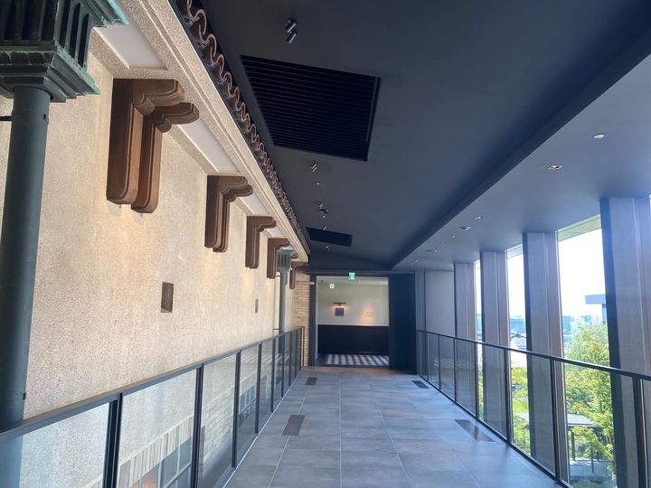 レストランの外壁に施された3階渡り廊下のスパニッシュ瓦や腕木にも注目! 当時の意匠を最も近くで見ることができる場所です。 出典: 美人百花.com