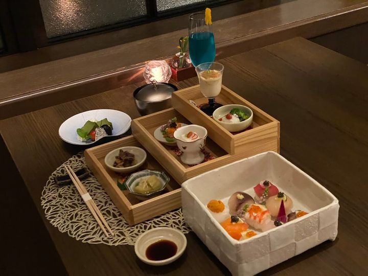 夜はちょっぴり贅沢に寿司ディナーを堪能。エディターは、せっかくなので京都発祥の手まり寿司が含まれた「シグネチャーコース Sushi -Temari」をいただきました。ホテルの大階段をモチーフにした木の器には、季節の前菜6種が盛られています。主役となる、ころんと可愛いらしい一口サイズの手まり寿司は、まるで宝石のように彩り豊か! さらに、“青龍”をイメージした鮮やかなブルーのカクテル「ブルードラゴン」をお供に、目でも存分に楽しめるディナーとなりました。