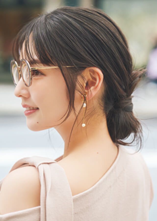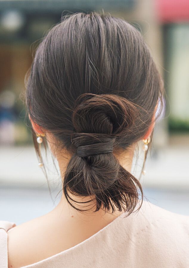 低めの位置でポニーテールをつくったら、ねじりながら折りたたみヘアゴムでまとめる。髪を一束だけ残しておいてゴムを隠すと◎。