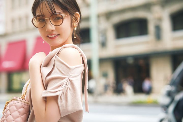 ピンクトップスには、可愛らしい印象を底上げしてくれるラウンドフレームがおすすめ。華奢なパールアクセで上品に仕上げるのもサングラスの強さを和らげる1つのテクニックです。
