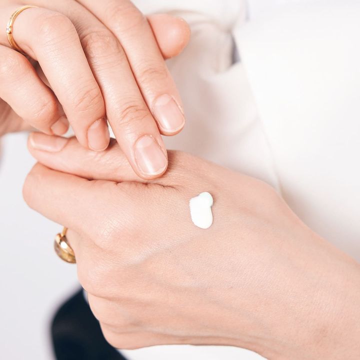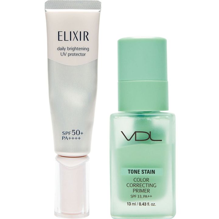 エリクシールのUV乳液デーケアレボリューションを顔全体に。その後再度エリクシールとVDLのミントの プライマーを手の甲で混ぜてなじみやすく。赤み肌をフラットに。