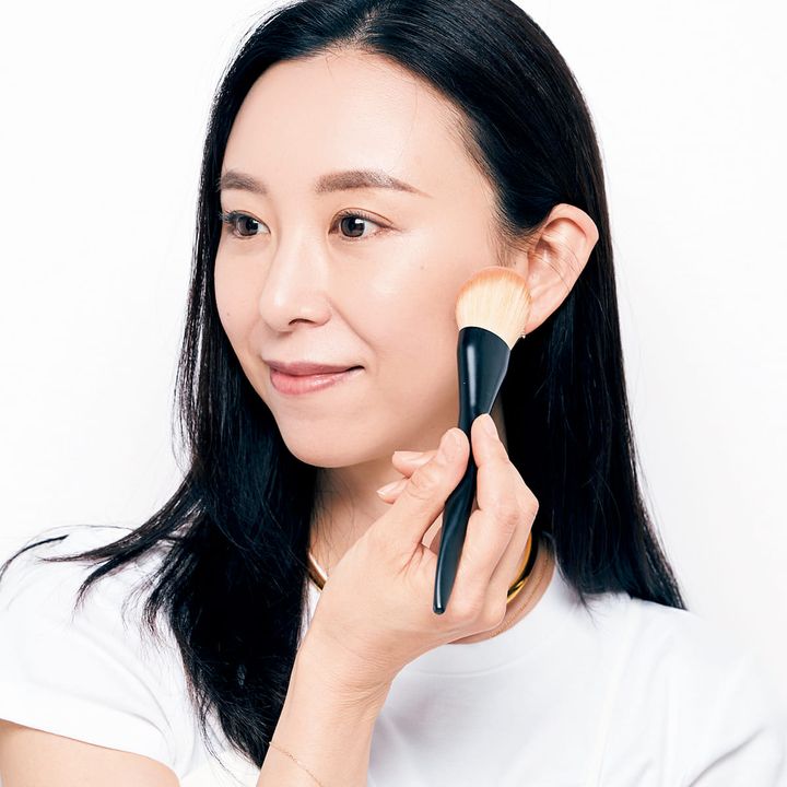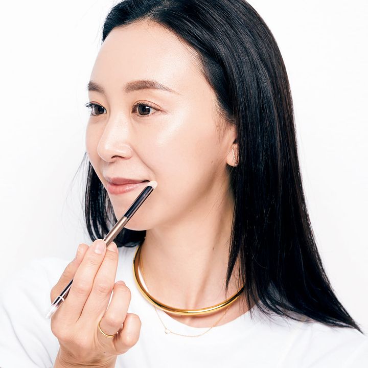 ディオールのグロウタイプのリキッドファンデは薄づきでフィット。コンシーラーもディオール。ブラシで小鼻と口元のくすみを消して口角もキュッと上がった印象に。
