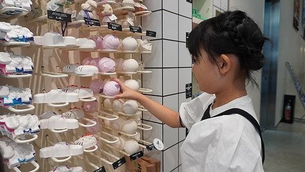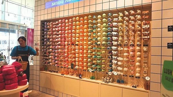 世界中から愛されるラッシュのバスボムが壁一面にずらり!カラフルな色合いやキャラクターコラボデザインに、子どもたちのテンションも上がります。