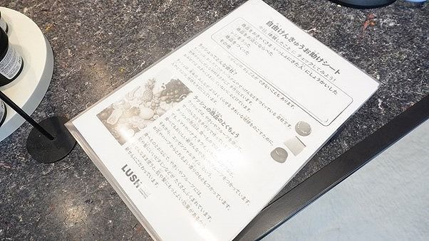お土産と共にもらえる「自由研究お助けシート」。LUSHの環境への配慮や商品への想いが綴られています。体験を受けて「感じたこと」「これから取り組んでみたいと思ったこと」などをまとめるシートになっていて、「一日体験」だけで終わらない、子どもたちに”自分で考えさせる”仕組みになっています。