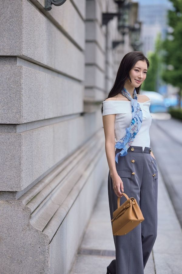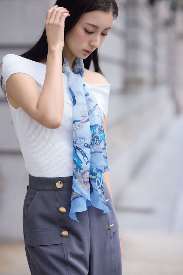 エレガントに垂れるナロースカーフは、きれいめな肌見せ服と相性抜群。夏は涼しげなシアー素材を味方につけながら、華やかカラーが効いたメリハリのあるデザインを選んで、女っぽく落とし込むのが百花レディ流。