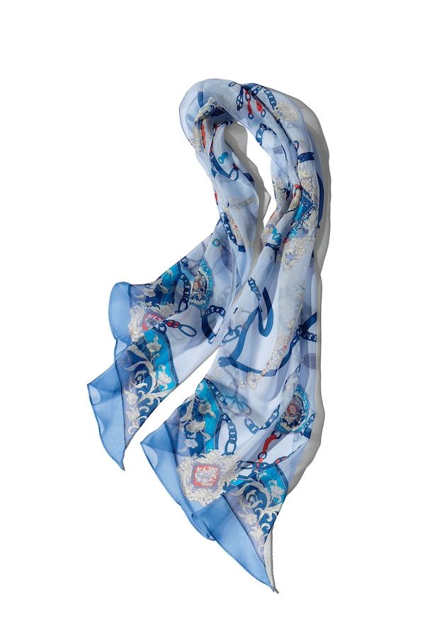 ブルーのスカーフは、ワンポイントで赤色が入ったデザインを選ぶことで迫力が出すぎず百花フェミニンにマッチ。金ボタン付きのマリンパンツと合わせて、クラシカルな着こなしを堪能して。