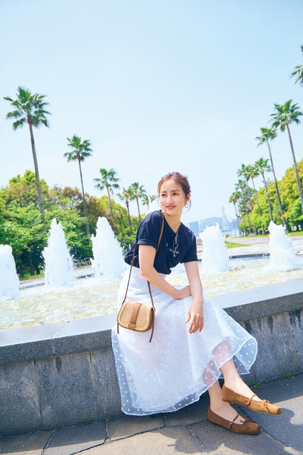スカート¥15,950/WILLSELECTION(WILLSELECTION ルミネ有楽町店) Tシャツ¥2,980/アテニア ピアス¥44,000/ミチ ウィルウェイ(14 SHOWROOM) サングラス¥66,220/オリバーピープルズ(ルックスオティカジャパン カスタマーサービス) バッグ¥49,500/ケイト・スペード ニューヨーク(ケイト・スペード カスタマーサービス) 靴¥40,700/HEWN(クルーズ ショールーム)
