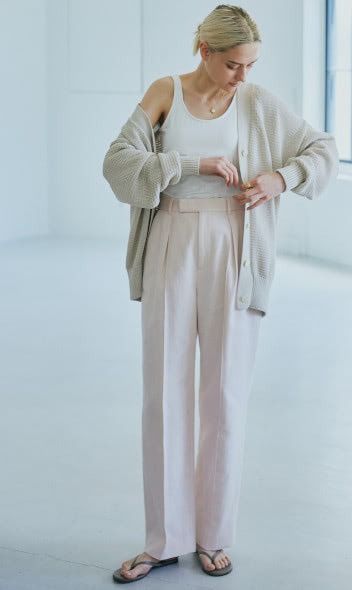 「素肌との組み合わせ」は暑い季節ならではのオシャレの楽しみ。デコルテや腕を潔く出した、タンクトップやキャミソールに「もう1枚」重ねて2枚セット感覚のインナーコンシャスな装い。そんな夏のレイヤードに起用したいのが、素肌をくるむように、あるいは肩にひっかけるようにして羽織るサマーニット。あたたかみのあるニットの重厚感と肌感の抜けが相まった、簡単に作れる絶妙なバランスは、淡い配色をまとめる深みとしても好作用。