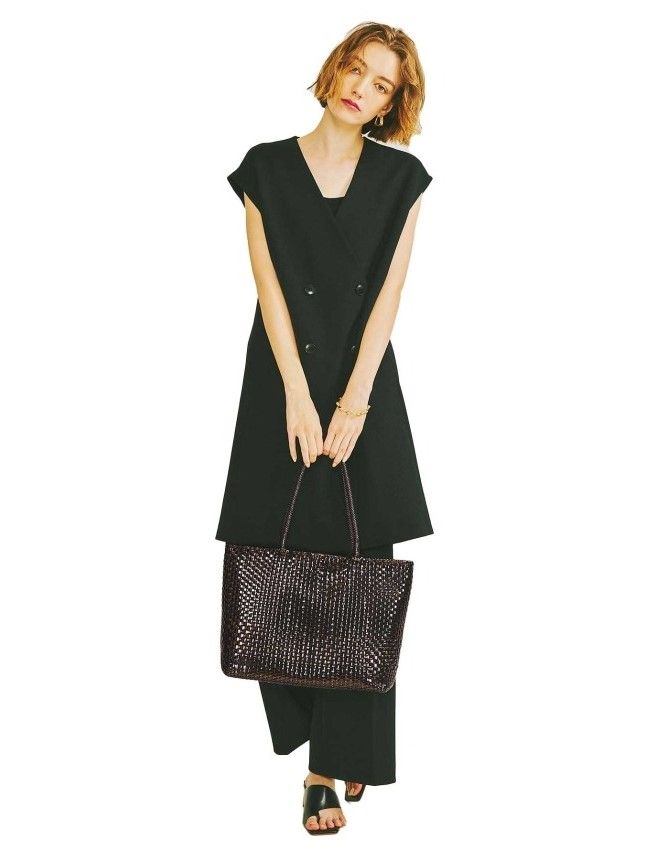 合わせの基本だけに羽織るジレにデザイン性を。縦のラインを強調するノースリーブを生かして、細く長いシルエットが使いやすくておすすめ。肩を覆うような「ノースリ気味」のデザインなら腕の華奢見えにもひと役。