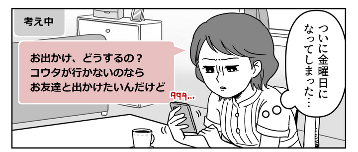 私はアリサ(40代)。私はお出かけが大好きです。子どもと知らない街を探索したり観光したり。もちろんお友達と出かけることも好き。とにかく外に出るのが好きです。夫・コウタ(40代)を誘うこともあるのですが、「家でのんびりしたい」と断られます。しかしなぜか私が誘わず出かけると拗ねてしまうんです。だから今回は早めに「週末出かけよう」と誘ったら「考え中」と返信がきました。行かないなら行かないで、私は別のお友達を誘って予定を固めたいのに!
