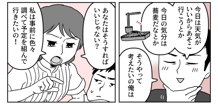 夫は、朝起きた気分で出かけるか出かけないかを決めたいと言います。そしてそのあとにどこに行くかもその日の気分の赴くまま。