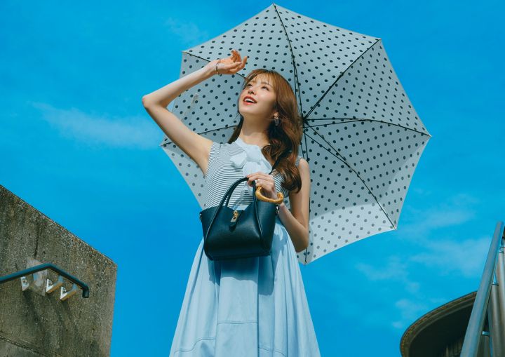 ボウタイトップス¥11,880/CELFORD ルミネ新宿2店 スカート¥23,100/FRAY I.D ルミネ新宿2店 黒バッグ¥8,800/オリエンタルトラフィック(ダブルエー) ぺたんこパンプス¥18,150/ダイアナ(ダイアナ 銀座本店) 晴雨兼用傘¥14,300/トラディショナル ウェザーウェア(トラディショナル ウェザーウェア ルミネ有楽町店) 時計¥30,800/マトウ(エイチエムエスウォッチストア 表参道) クリアピアス¥7,700/アビステ