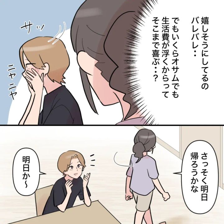 オサムさんに、息子メグルくんと一緒に実家に帰ろうかなと提案したマホさん。オサムさんが家事をすることを心配する演技をすると、マホさんが実家に帰ることに前のめりに賛成し出し、顔からはこらえようとしても溢れる笑顔が!明日帰ると言うマホさんに、「用事があって送れない」と言うオサムさん、もう怪しさしか感じませんが、一体何を企んでいるのでしょうか?