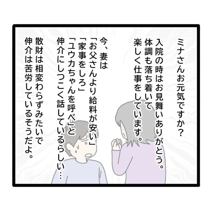 「ミナさんお元気ですか?入院の時はお見舞いありがとう。体調も落ち着いて、楽しく仕事をしています。今、妻は『お父さんより給料が安い』『家事をしろ』『ユウカちゃんを呼べ』と、伸介にしつこく話しているらしい・。散財は相変わらずみたいで、伸介は苦労しているそうだよ」と書かれていました。