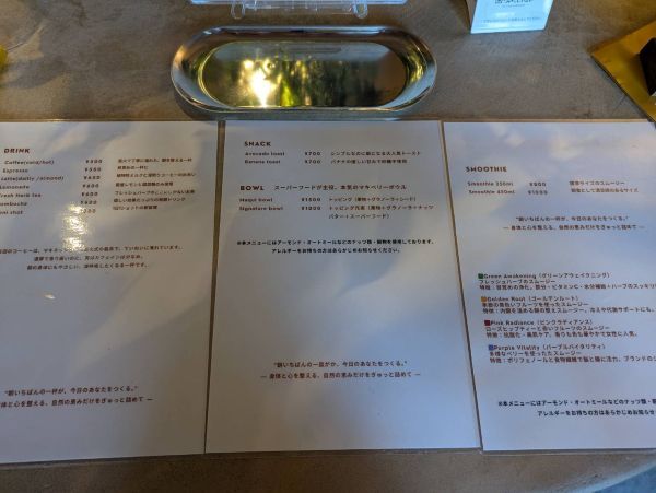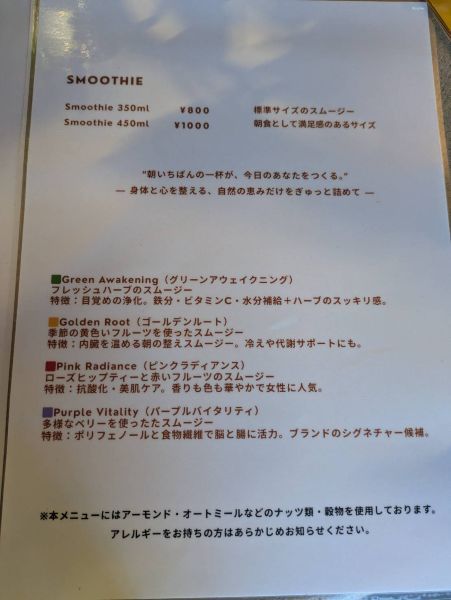 こちらがお店の一番の売りである、スムージーのメニューになります。4種類、自分の体や心の状態に合わせて選べます。どれにしようか迷っちゃう……。