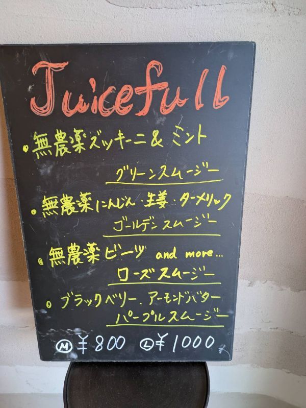 そしてお店の黒板にはそれぞれのスムージーの中身の食材が書かれています。こちら実は固定ではなくその時期に合わせた食材で組み合わせされているとのことなんです!