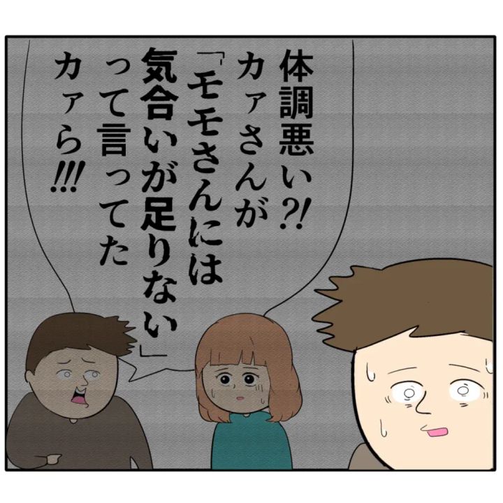 三郎さんはこれまでの自分の言動を思い返しました。モモさんが体調が悪いと言ったときに、心配するどころか「体調悪い?!カァさんが『モモさんには気合いが足りない』って言ってたから!!!」と責めたり、