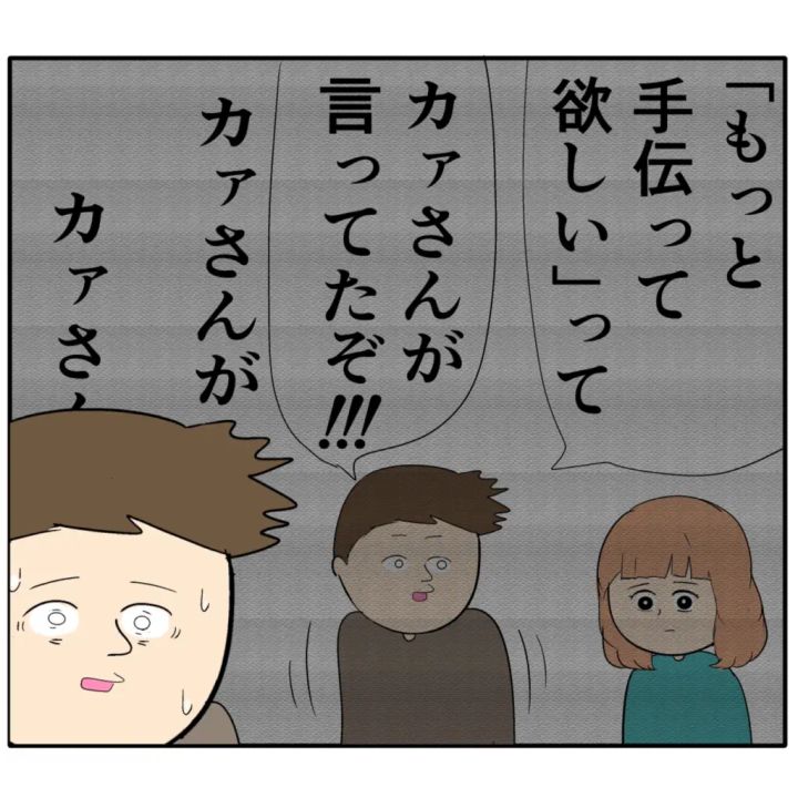 「『もっと手伝って欲しい』ってカァさんが言ってたぞ!!!」と、モモさんの話は聞かず、義母の愚痴をそのままモモさんに伝えたり、