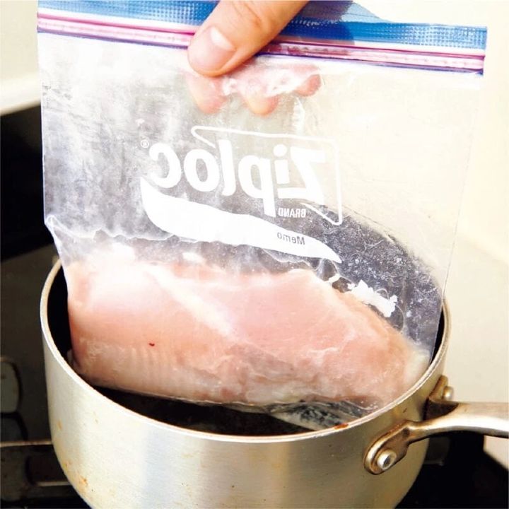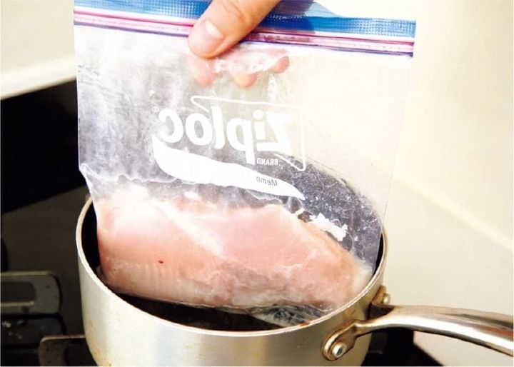 鶏ハムは鶏むね肉を袋ごと熱湯に入れて、余熱で火を通します。この方法なら、火の入れすぎでかたくなってしまうことはありません。45分ほど放置するだけで完成する超簡単レシピです。