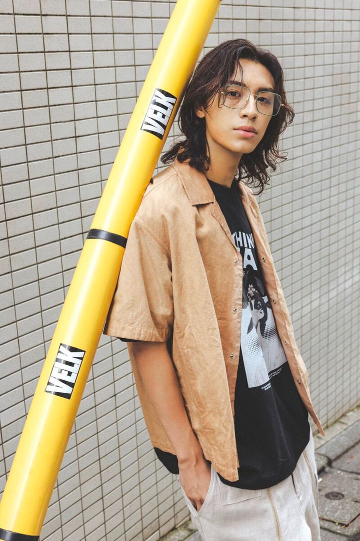 Tシャツ¥19,800/マインドシーカー、メガネ¥19,800/メッシーウィークエンド(ともにジョワイユ)、肩かけしたシャツ¥24, 200/アズ スタンダード(アドナスト ミュージアム)、パンツ¥35,200/ネイタルデザイン(スキャターブレイン)