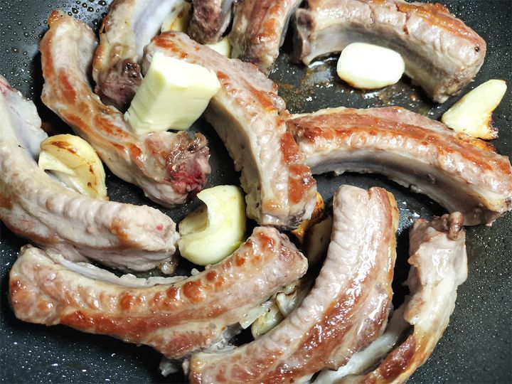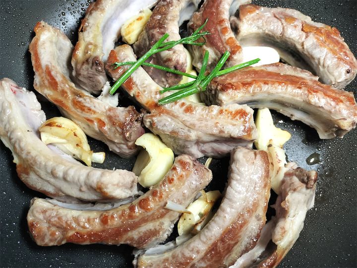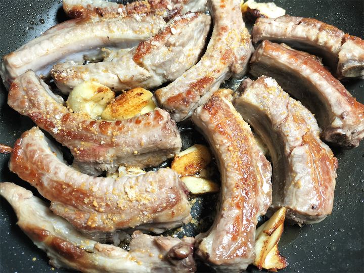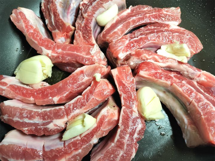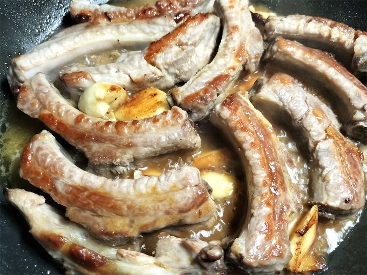 4. フライパンを洗わずにオリーブオイル大さじ1を引き、にんにくとスペアリブを入れます。