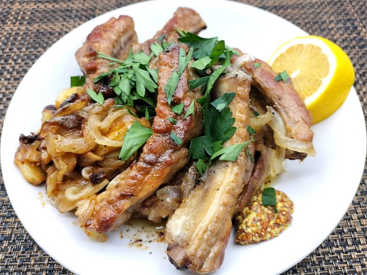 BBQでよく食べられるためBBQソースが一般的ですが、わたしは某ハンバーガーショップでもBBQソースよりマスタードを選ぶくらい甘みより塩気や辛みの方が好きです。ですので、まさかスペアリブを塩味でおいしく食べられるとは思っていませんでした。しかも屋外でなく普通にフライパンで出来たことが驚きです。さすが川越シェフです。