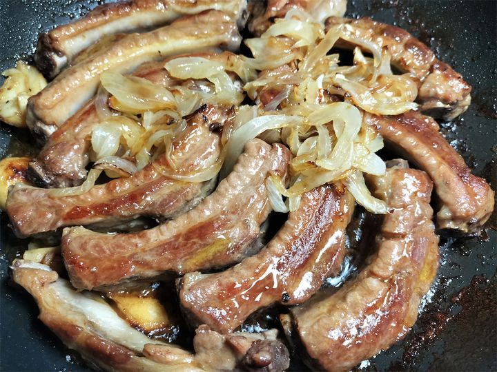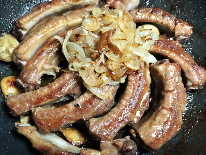 10. フタを開け、ある程度水分が無くなるまでスペアリブの両面を返しながら焼きます。