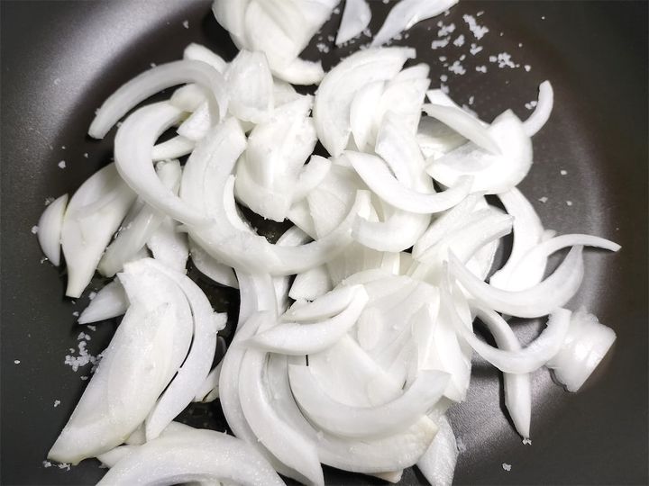 2. フライパンにオリーブオイル大さじ1と玉ねぎを入れて塩を振ります。