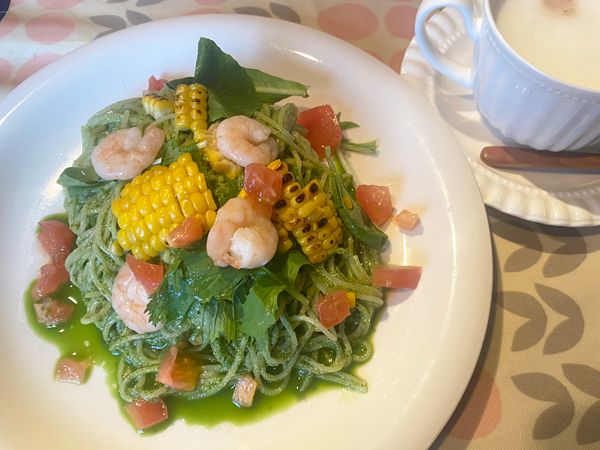 やっぱり夏は冷製パスタでしょ!ということで、小えびと焼きとうもろこしの冷たいジェノベーゼ(冷)をチョイス。