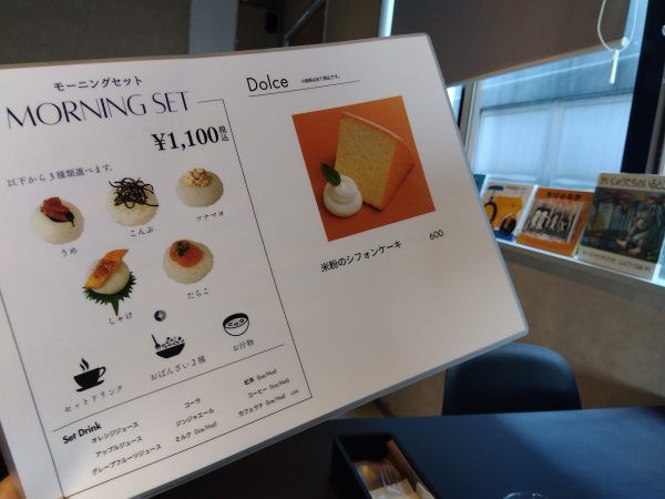セット内容は、うめ、こんぶ、ツナマヨ、しゃけ、たらこから3個を選べるおにぎり、あったかいお汁物、季節のおばんざい2種類に、コーヒーや紅茶、ジュース類から好きなドリンクを選べますよ。平日9:00(休日は8:00)~11:00(10:30L.O.)なので、遅い出勤の日やおでかけ前の朝ごはん、ブランチ、のんびり過ごす休日の朝にもピッタリですよね。人気の米粉のシフォンケーキを追加するのもいいですよね。