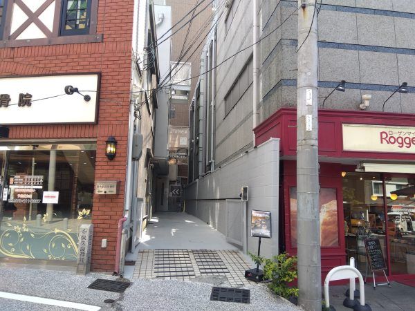 路地の奥まで行ったら、ビルの中へ。階段を上がるとカフェです。ベビーカーでの利用の場合は、スタッフさんがお手伝いをしてくれますよ。