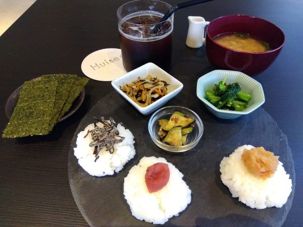 カフェの朝定食は、おばんざい、汁物と選べる3種類おにぎり&ドリンク付き!