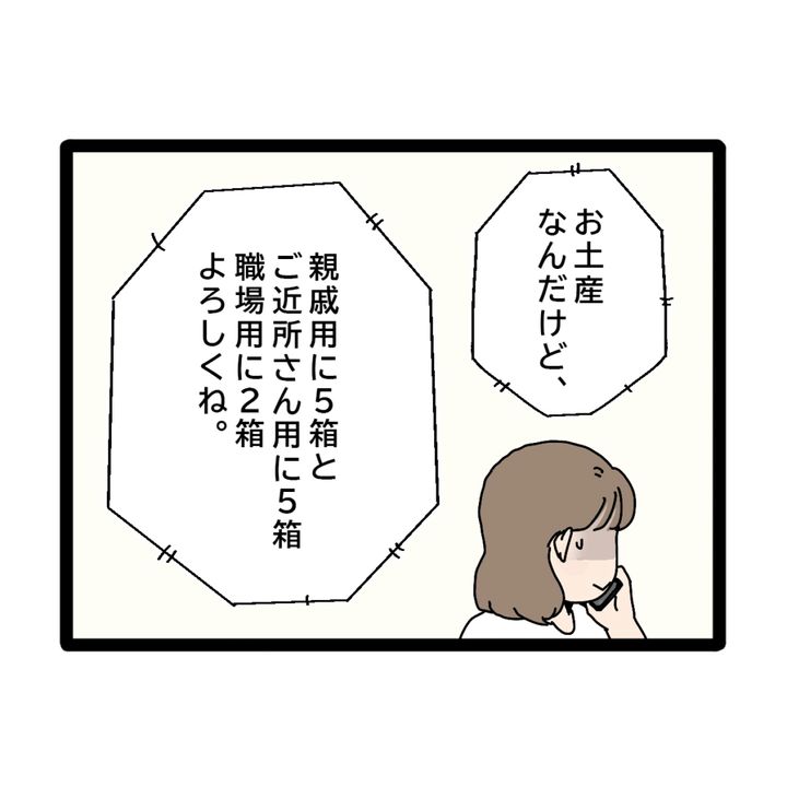 すると義母は「お土産なんだけど」と切り出しました。ホラきた。帰省の手土産を義母はいつも指定してくるのです。「親戚用に5箱と、ご近所さん用に5箱、職場用に2箱よろしくね。」義実家に持って行くお菓子の他に、12箱も!私たちが帰省するたびに、あちこちにお菓子を配って回りたい義母はいつも当然のように行ってきます。もちろん手土産を持って行くつもりですが、帰省時に会わない親戚や、会ったこともないし今後も関わらない職場の人用にまで買って行く必要があるのかな。