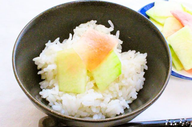 ご飯に乗せて食べてみると、白い皮の部分は違和感が無く、コリコリとした浅漬けとしてさっぱりといただけます。