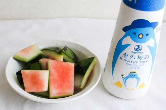 白い皮を食べてみると、コリコリとしていて程よい塩味が付いていて、さっぱりとしたおいしさ。すいかはウリ科の植物なので、瓜の浅漬けのような味わいがします。