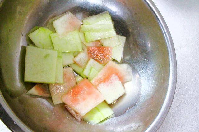 1. 緑色の皮を切り落とし、白い皮を食べやすい大きさに薄切りにします。