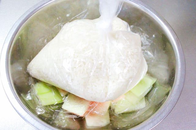 重石の重さは不明だったので、今回はポリ袋にお米を450g詰めたものを重石にしました。この状態で冷蔵庫で2時間ほど漬けました。