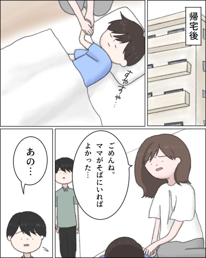 友達家族と出かけた公園で、ショウがジャングルジムから落ちてしまい頭を打って大泣き。「ショウは僕が見てるから」というユウタの言葉を信じてショウを任せた私は激しく後悔しました。ユウタは義母との電話に出るためにショウから目を離していたのです。帰宅後、すやすやと眠るショウの顔を見ながら「ごめんね。ママがそばにいればよかった・・」と謝りました。すると、「あの・・」とユウタが話しかけてきて、