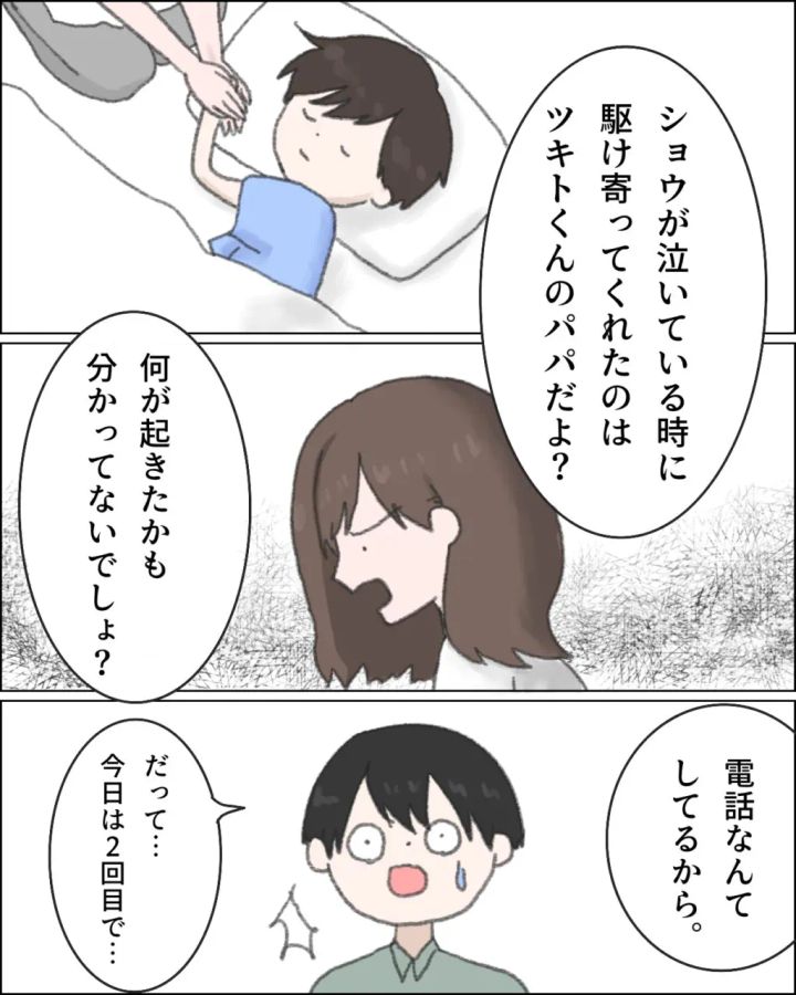 「ショウが泣いている時に駆け寄ってくれたのはツキトくんのパパだよ?何が起きたかも分かってないでしょ?電話なんてしてるから」と詰め寄ると、「だって・・今日は2回目で・・」と言い訳するユウタ。