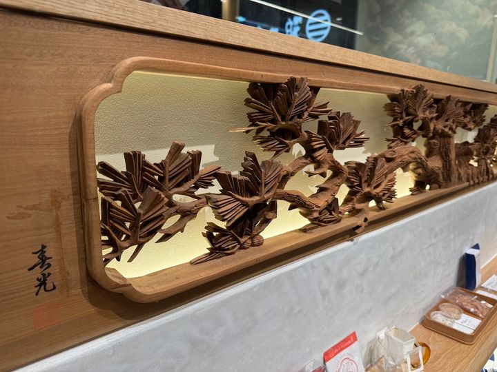 本店の雰囲気を味わってもらえたらと店舗デザインにもこだわっているそうで、ライブキッチンの欄間は本店の庭に植栽された松の木をイメージしています。