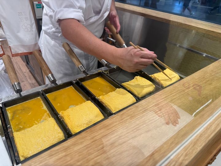 そんな「京都離宮」のだしまきたまごは、どのようにして作られているのか。京都駅店では、ガラス越しにだしまき職人がだしまきたまごを作っている様子を見学できちゃうんです。ライブキッチンを舞台に見立てているのも、京都駅店が「おだしの劇場」と位置付けている理由です。