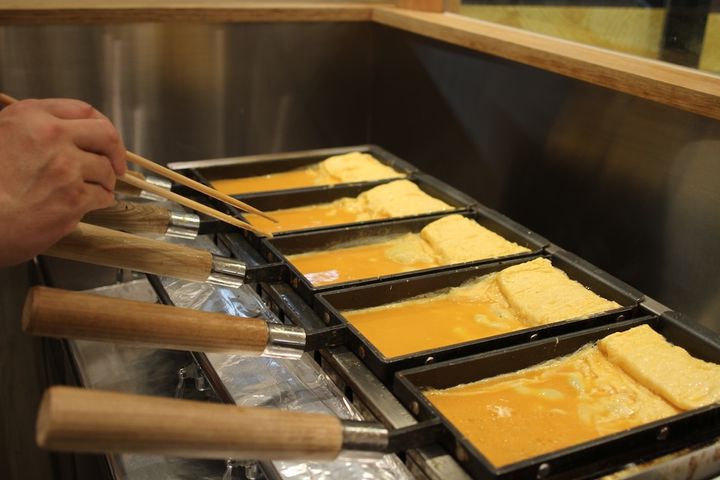 5つの鉄鍋を自在に操り、きれいにたまごをまいていく様子は「すごい!」の一言。熟練の技が光る手さばきはSNSでも話題となり、お店の外である南北自由通路からも足を止めて見るお客さんが多いのだとか。