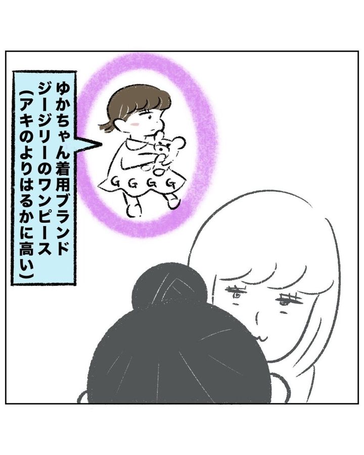 アキくんよりも高いブランドの服をゆかちゃんに着せていながらまるさんに「お金持ち」と言ってきたゆかちゃんママに「なんだこいつ?」とまるさんはイライラ。