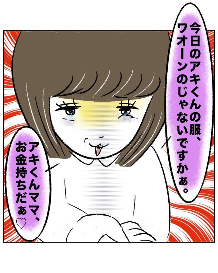 ゆかちゃんママは、まるさんの腕を掴んだまま「今日のアキくんの服、ワオーンのじゃないですかぁ。アキくんママ、お金持ちだぁ」とまるさんをおだて始めました。