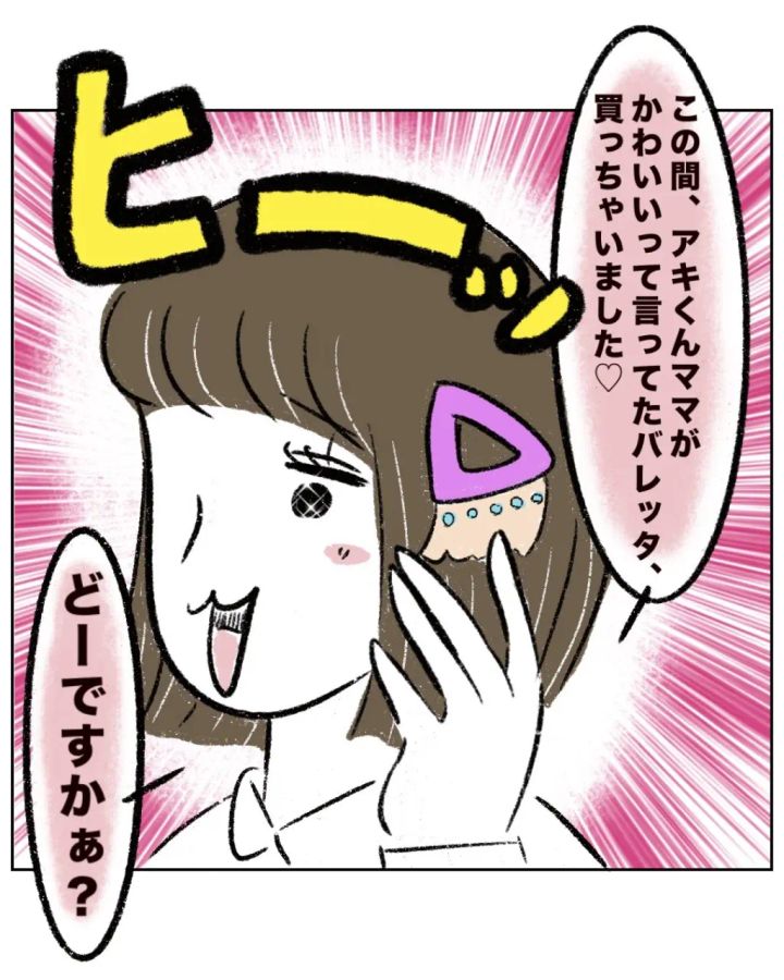 そして、「この間、アキくんママがかわいいって言ってたバレッタ、買っちゃいました。どーですかぁ?」と自らアピールしてきたゆかちゃんママ。