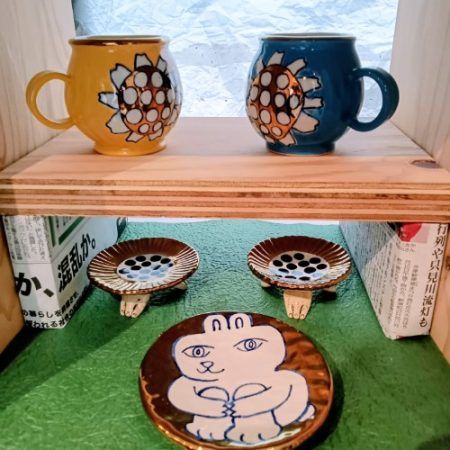 はなみずき書店では〇○フェア=企画販売を開催することもあります。先日バリスタを招いて行われた企画「コーヒーな2DAYS」ではこちら↓須賀川の陶芸家 根本 裕子さんのオリジナルブランド「SANZOKU」の展示販売もありました。全て一点もので福島ではここでしか買えないそうです。