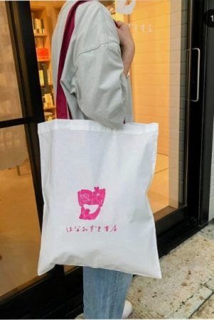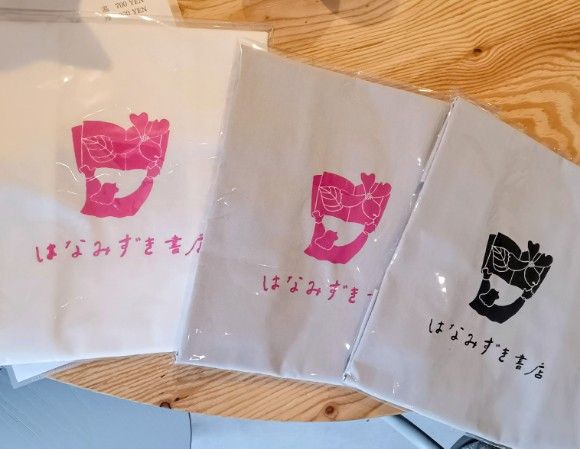 カラー違いで3種類のトートバッグには、はなみずき書店のロゴと優しい文字で店名が書かれています。
