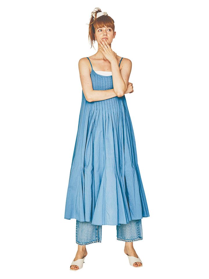 インナーを着てもバランスがとりやすいアメスリ気味のキャミワンピース。ドレープのきいたエレガントなフォルムを、くすんだブルーで大人びた甘さに。フロントのタックが胸下から広がることで、上半身はシャープ、腰から下は華やかなルックスを形成。裏地つきで透ける心配もなし。